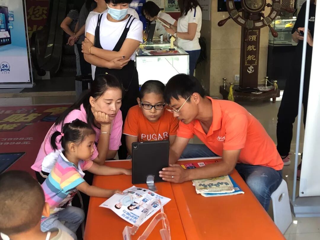 工作人员在认真、耐心地教孩子和家长们智能家教机的使用方法。