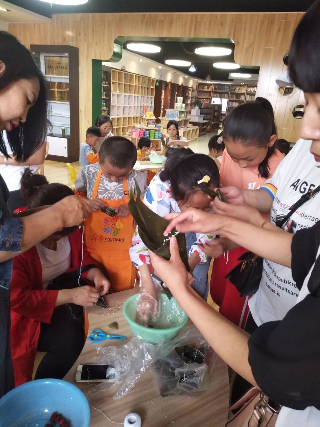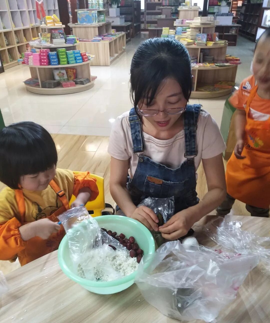 老师在耐心的教孩子们包粽子。