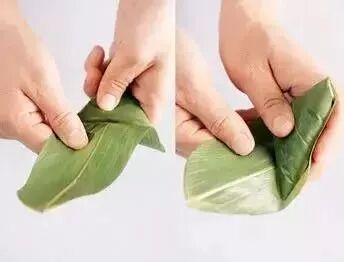 上部的粽叶向下折,直到完全盖住开口为止,顺着三角的边将所有的粽叶都折好。