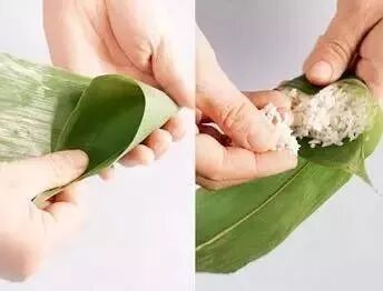 取一片宽大的粽叶,卷成一个圆锥状,在圆锥的筒中装入准备好的馅料。