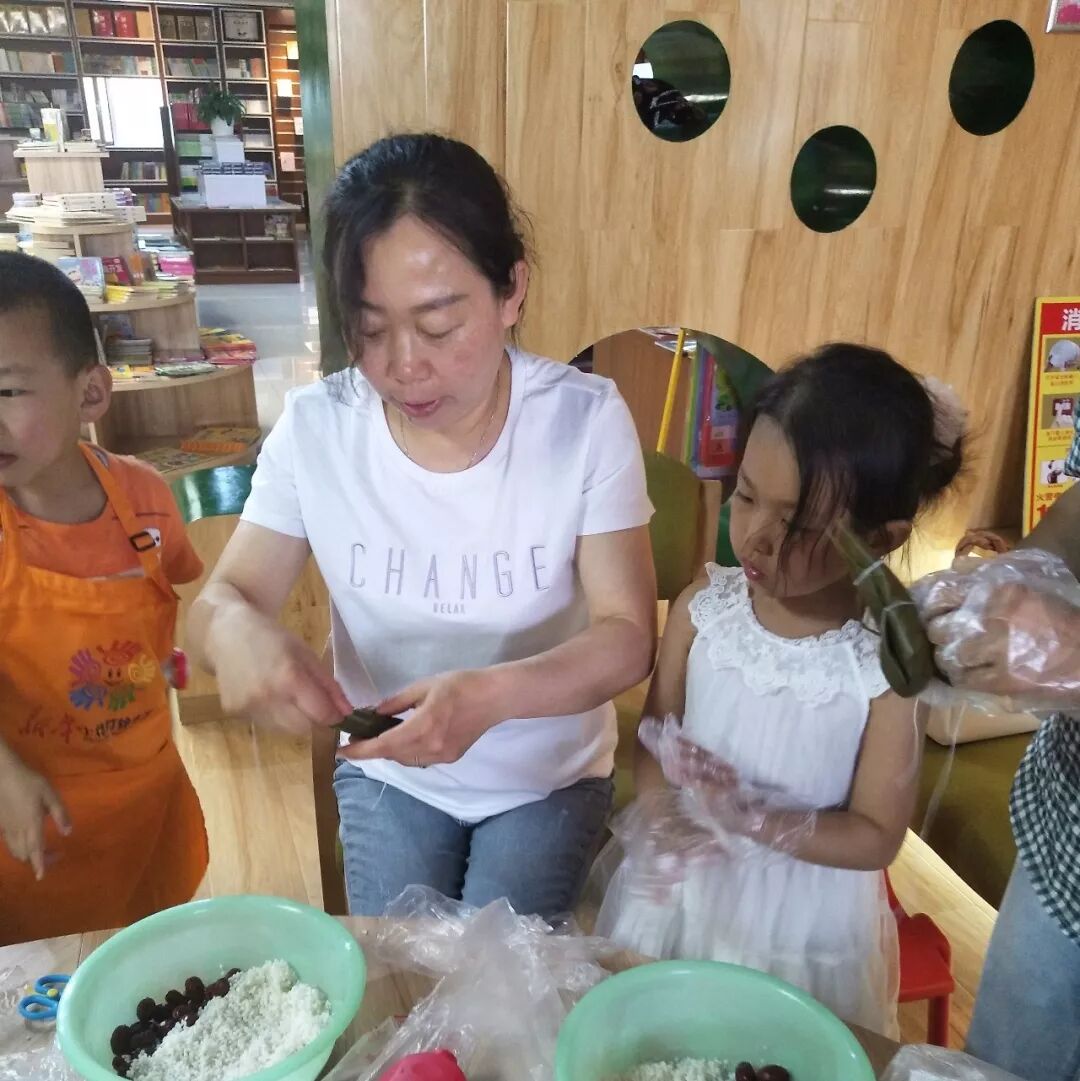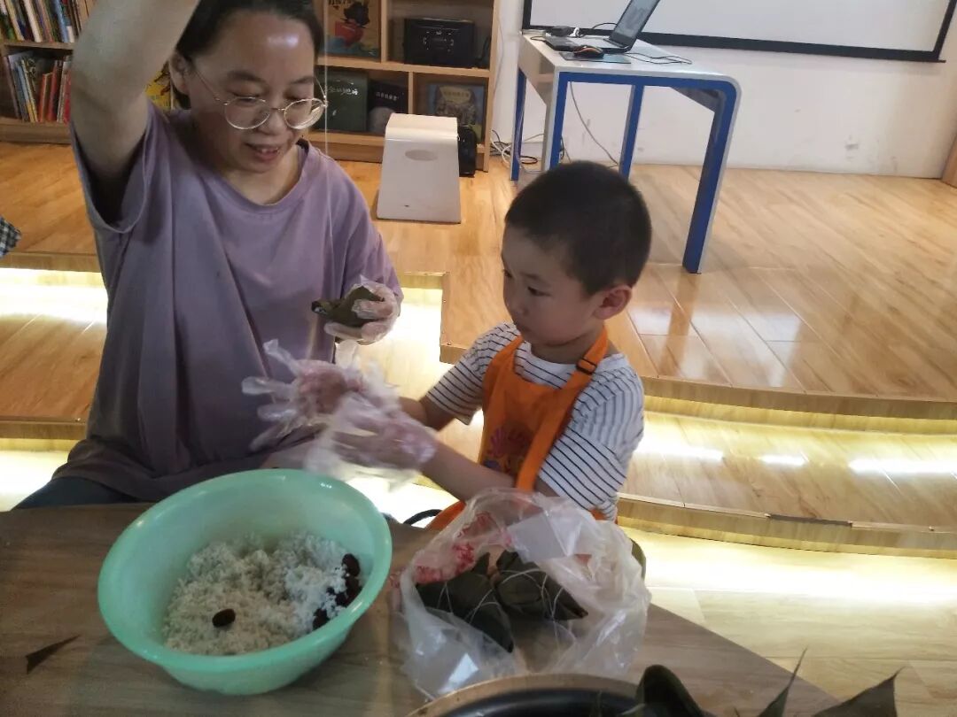 在一片欢声笑语中,进入到了家长和孩子最期待的环节——包粽子。香香的粽子是思念,青青的粽叶表惦念,粘粘的糯米是挂念,粒粒红枣表想念。