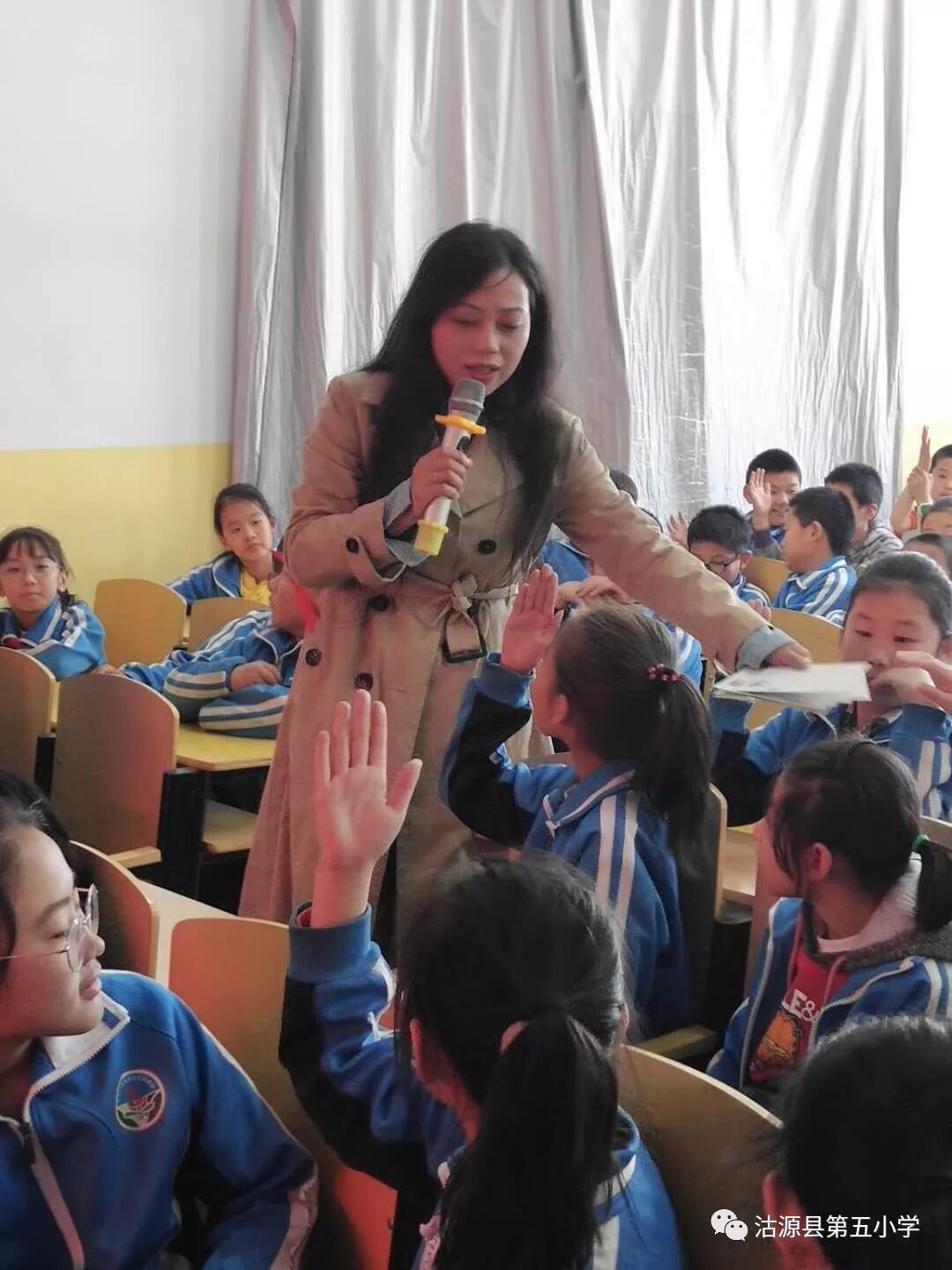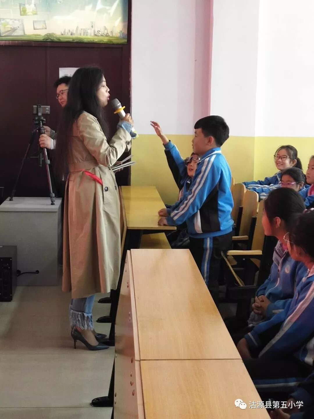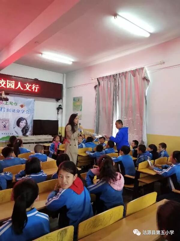 在多媒体教室,郁雨君老师和学生们进行了长时间的互动,现场气氛热烈,孩子们欢乐的笑声和热烈的掌声此起彼伏,郁老师的一句“善于记录生活中灵感的闪光点”让孩子们对写作有了更加深刻的认识和更加强烈的兴趣。 在与孩子们的互动中,郁老师不时提出的小问题和孩子们幼稚的回答,让整个场面生动活泼、趣味十足,郁老师对孩子们提出的问题的解答,也体现出了她未泯的童心和对孩子深深的爱。